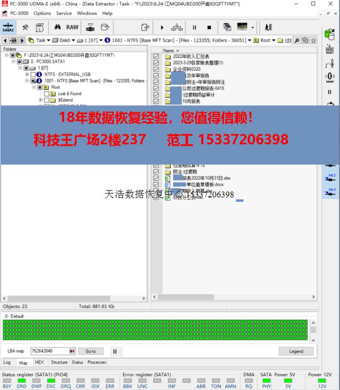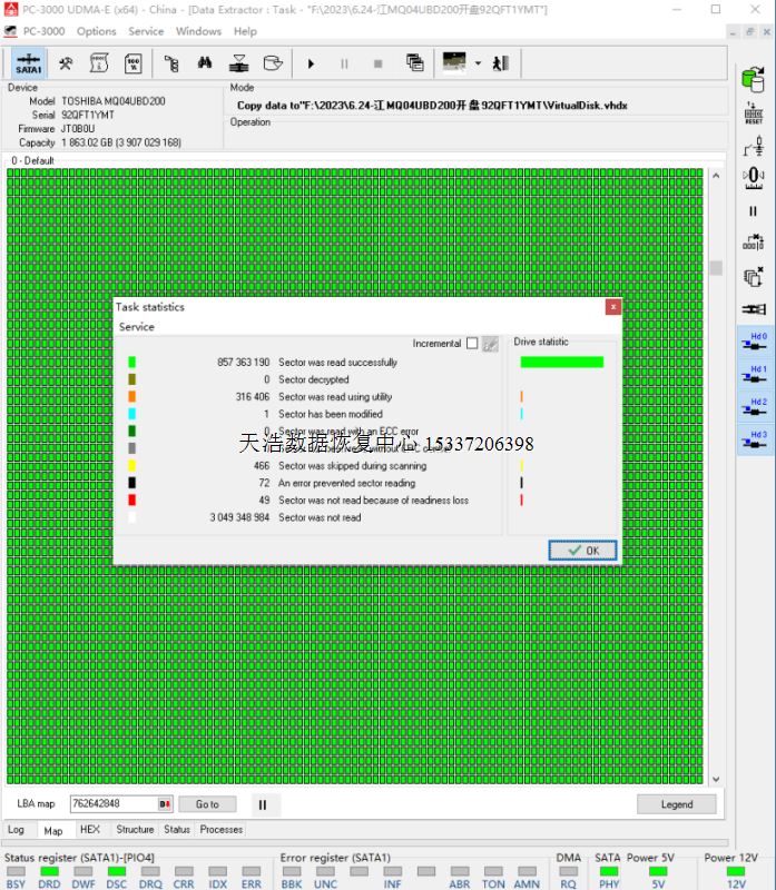解决方案:收到硬盘后,我们在无尘环境更换兼容的磁头,更换兼容的SATA电路板,再接到数据恢复工具PC3000 UDMA EXPRESS上,通电认盘,DE分头镜像,成功恢复客户硬盘内绝大部分数据。