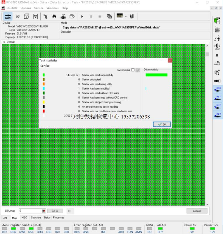解决方案:收到硬盘后,原usb板解锁、改SATA,接到专业数据恢复工具PC3000 UDMA EXPRESS上,检测、备份、修复固件问题后,断电通电硬盘正常认盘,DE建镜像任务,分头镜像,发现1头坏,先镜像023面数据,再在无尘环境更换兼容的磁头,再镜像1面数据,最后客户硬盘内的重要数据完整恢复!
