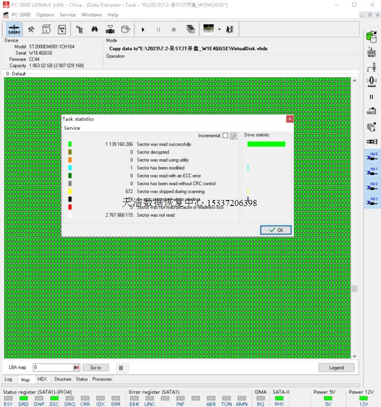 解决方案:收到硬盘后,接到数据恢复工具PC-3000 UDMA Express上,通电硬盘正常认盘,数据区前后都能正常访问,备份固件常规处理后,DE分头镜像,发现1头不良,在无尘环境更换兼容的磁头后,再镜像,最后硬盘内照片基本完整恢复。