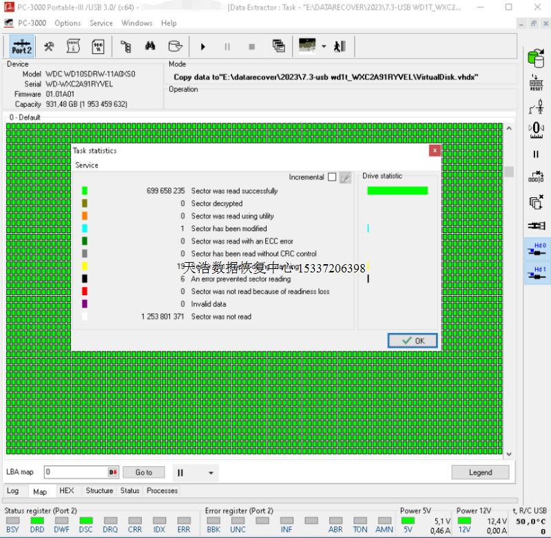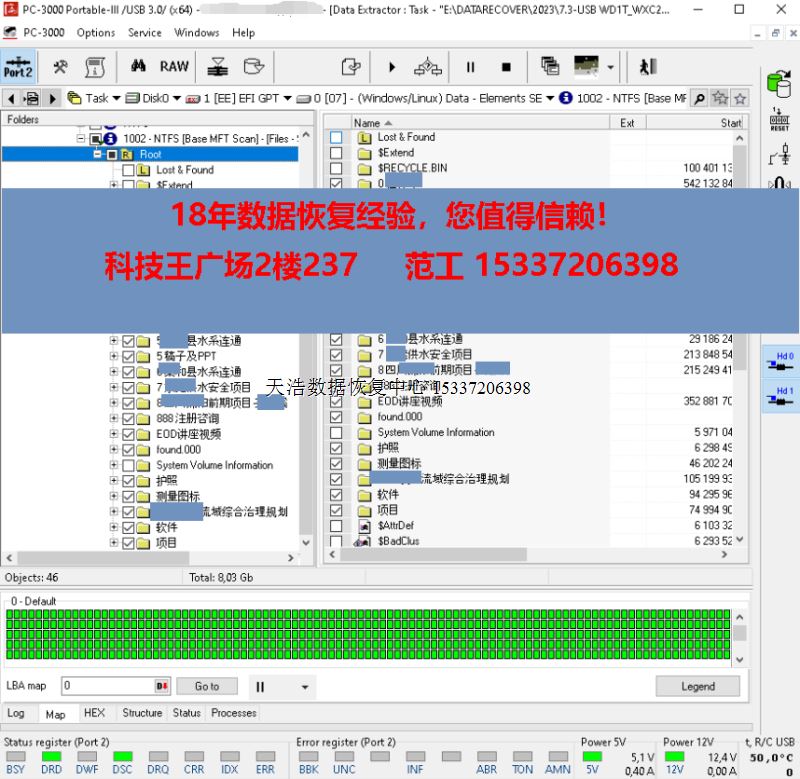 解决方案:收到硬盘后,在无尘环境更换兼容的磁头,原始usb板ROM解锁,改SATA,接到专业数据恢复工具PC3000 UDMA EXPRESS上,通电硬盘认盘,备份好关键固件,做好前期处理工作后,DE分头镜像,最后客户硬盘内重要数据基本完美恢复!