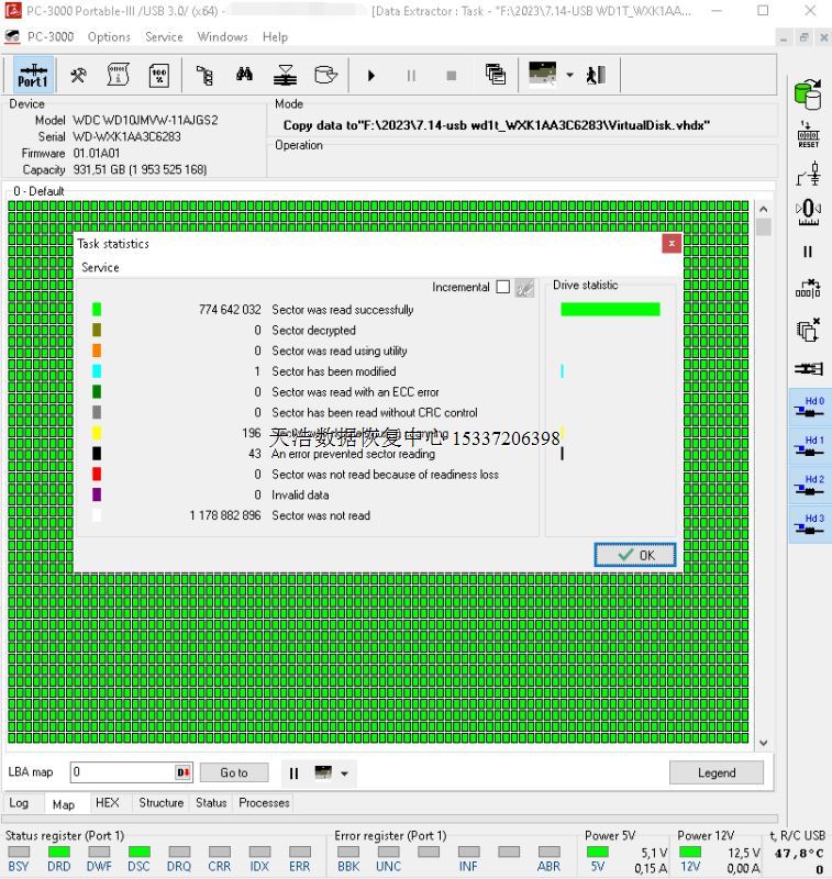 解决方案:收到硬盘后,在无尘环境更换兼容的磁头,更换兼容的SATA电路板,接到专业数据恢复工具PC3000 UDMA EXPRESS上,通电硬盘认盘,备份好关键固件,做好前期处理工作后,DE分头镜像,最后客户硬盘内重要数据基本完美恢复!