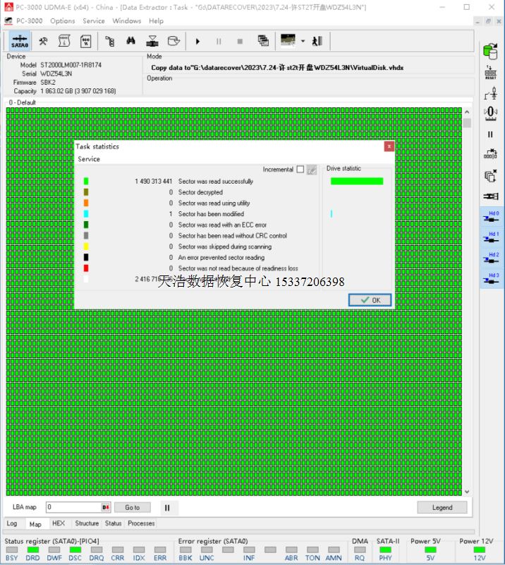 解决方案:收到硬盘后,接到数据恢复工具PC-3000 UDMA Express上,备份、检测修复固件后,做好镜像前的处理工作,DE分头镜像,发现1头不良,先镜像完023面的数据后,再在无尘环境更换兼容的磁头后,再镜像1面数据,最后客户硬盘内重要数据完美恢复!