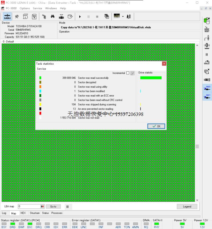 解决方案:收到硬盘后,接到专业数据恢复工具PC-3000 UDMA Express上,通电硬盘正常认盘,检测固件全部正常,硬盘扫描不正常,这是东芝台盘的通病,都是磁头不良导致的,在无尘环境更换兼容的磁头,再通电,硬盘正常认盘,数据区均能正常访问,DE镜像,成功恢复客户硬盘内几乎全部重要数据!