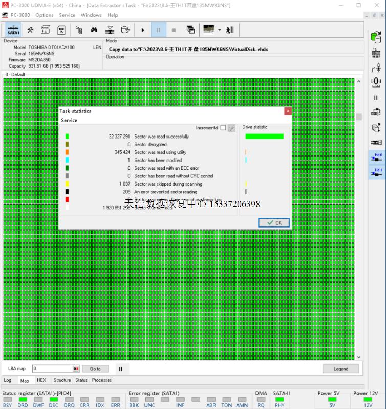解决方案:收到硬盘后,在无尘环境更换兼容的磁头,接到专业数据恢复工具ACE PC-3000 UDMA Express上,通电硬盘正常认盘,数据区前后均能正常访问,DE镜像,成功恢复客户硬盘内几乎全部重要数据!