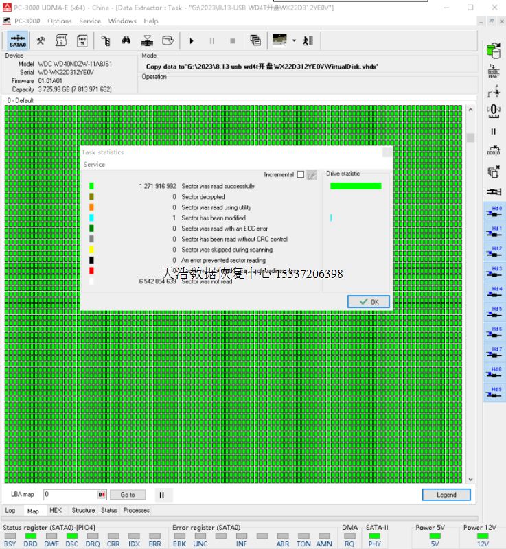 解决方案:收到硬盘后,我们在无尘环境更换兼容的磁头,再原板解锁,改SATA,接到专业数据恢复工具ACE PC3000 UDMA EXPRESS上,通电硬盘正常认盘,备份固件,做好固件常规处理操作后,DE分头,镜像,最后客户硬盘内重要数据基本完美恢复!