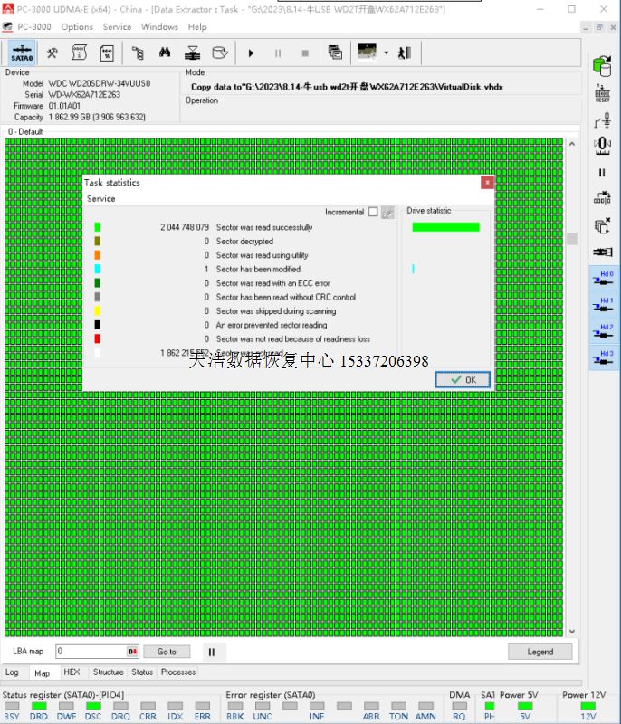 解决方案:收到硬盘后,在无尘环境更换兼容的磁头,原usb板解锁、改SATA,接到专业数据恢复工具PC3000 UDMA EXPRESS上,通电硬盘正常认盘,检测、备份固件,做好镜像前的处理工作后,DE建镜像,最后客户硬盘内1T重要数据基本完整恢复!