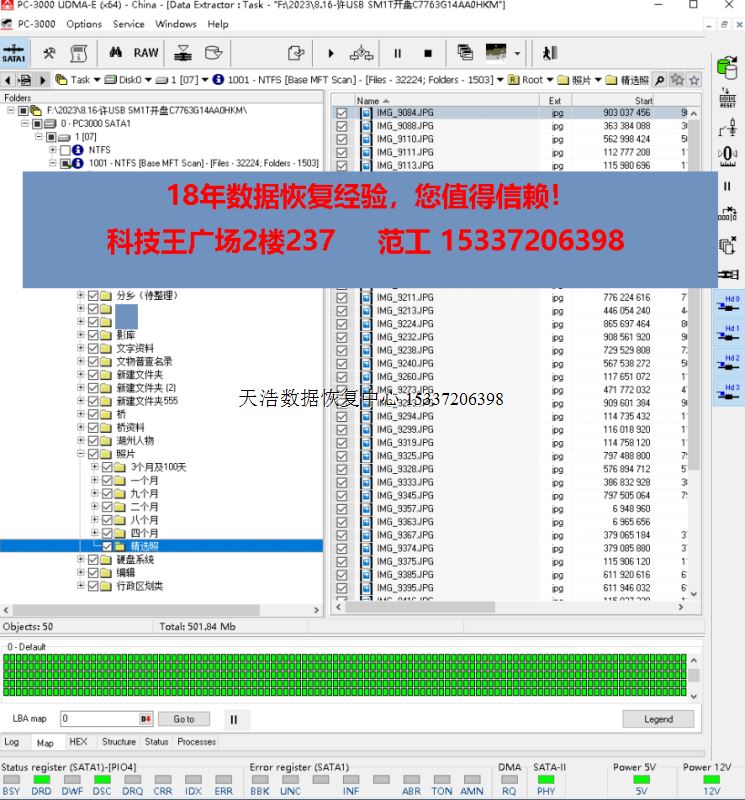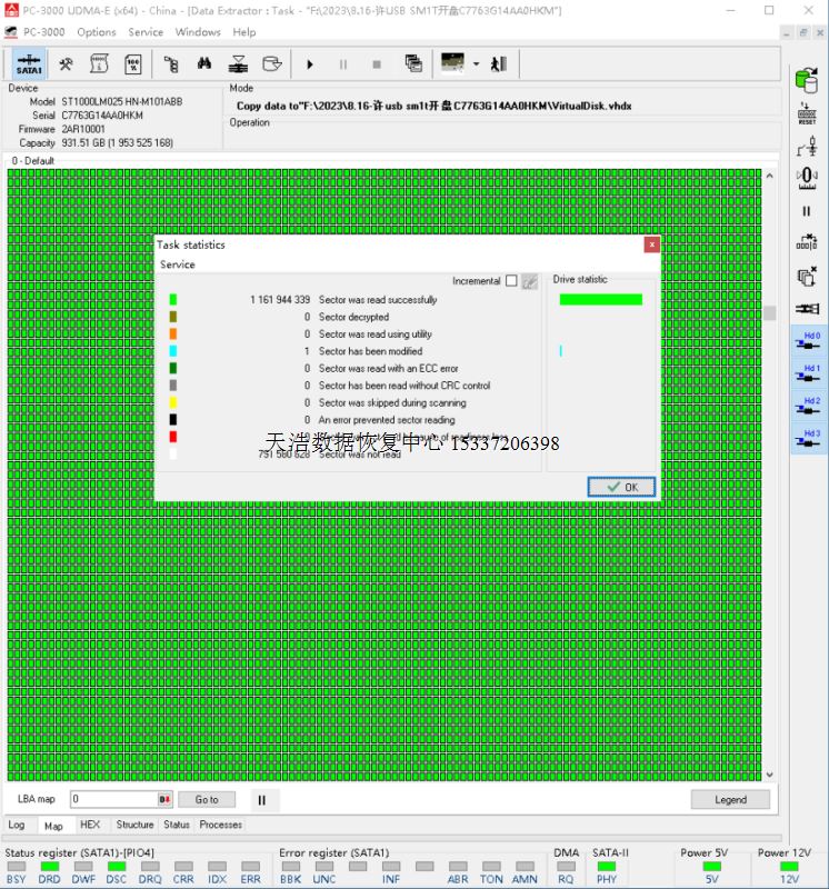解决方案:收到硬盘后,我们在无尘环境更换兼容的磁头,再更换兼容的SATA电路板,再接到专业数据恢复工具PC-3000 UDMA Express上,通电硬盘正常认盘,DE分头镜像,成功恢复硬盘内几乎全部数据!