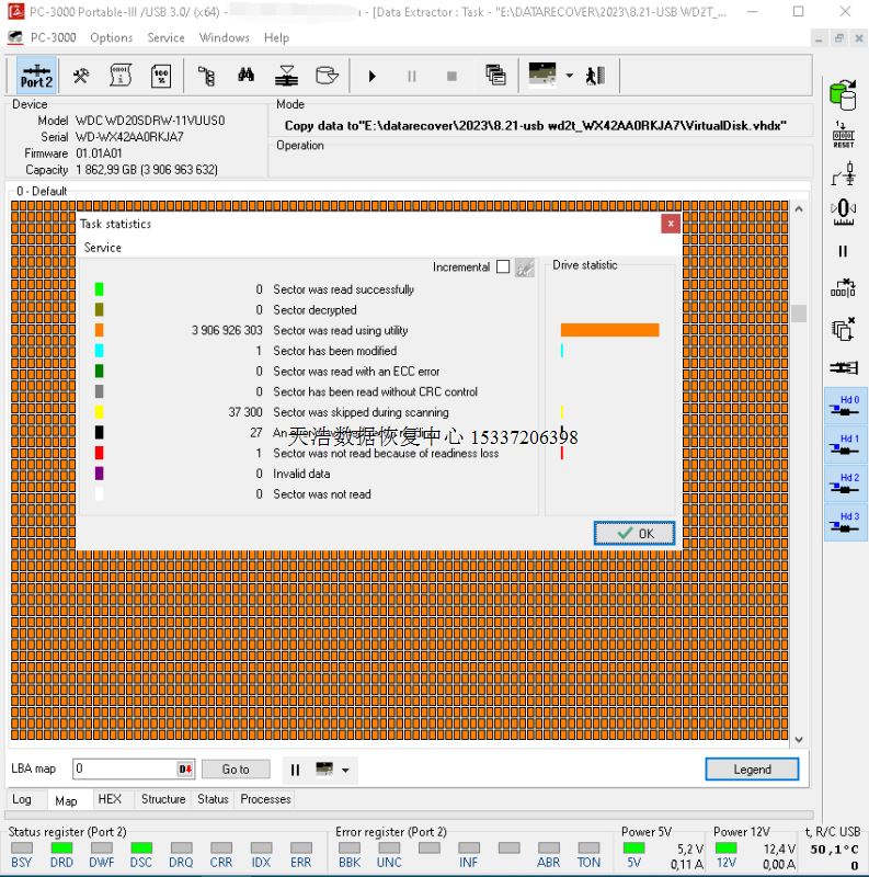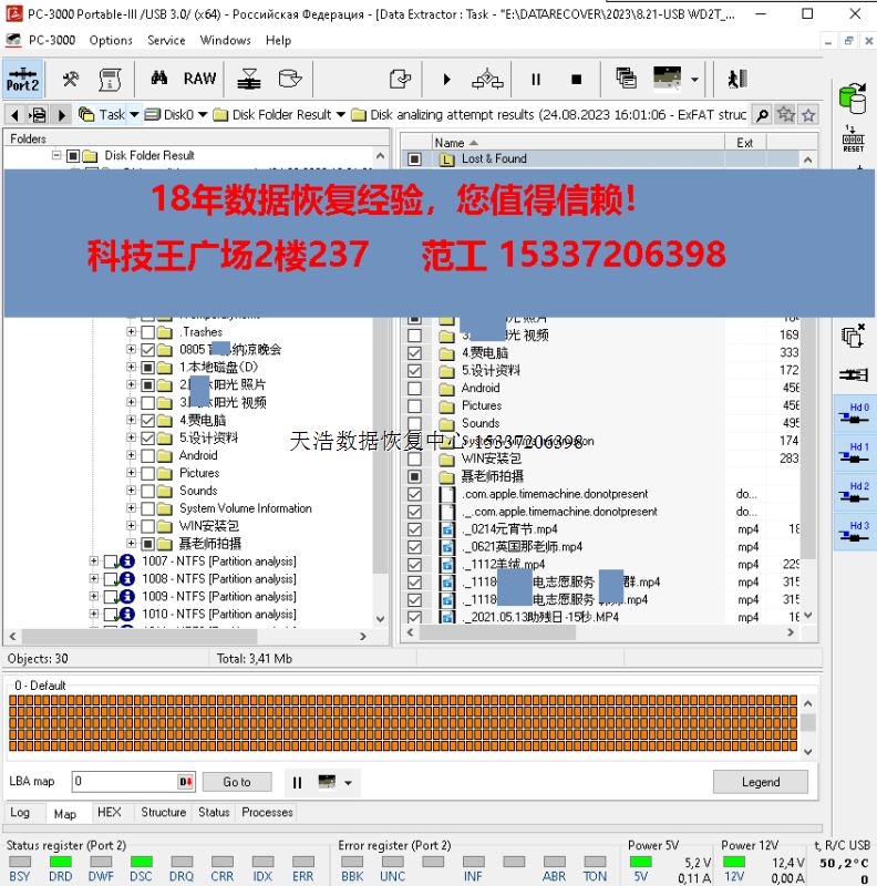 解决方案:收到硬盘后,在无尘环境更换兼容的磁头,原usb板解锁、改SATA,接到专业数据恢复工具ACE PC-3000 Portable III上,通电硬盘正常认盘,检测、备份固件,做好镜像前的处理工作后,DE建镜像,最后客户硬盘内重要数据大部分成功恢复!