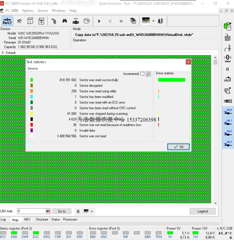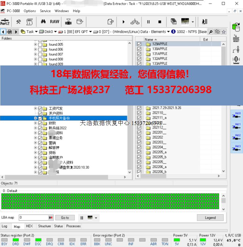解决方案:收到硬盘后,在无尘环境更换兼容的磁头,原usb板解锁、改SATA,接到专业数据恢复工具ACE PC-3000 Portable III上,通电硬盘正常认盘,检测、备份固件,做好镜像前的处理工作后,DE分头镜像,最后客户硬盘内重要数据大部分成功恢复!