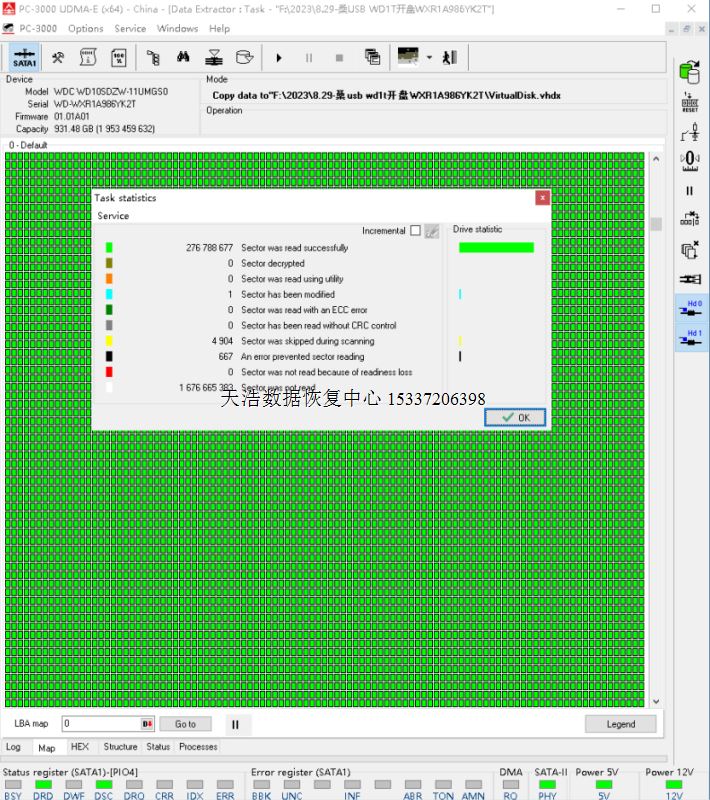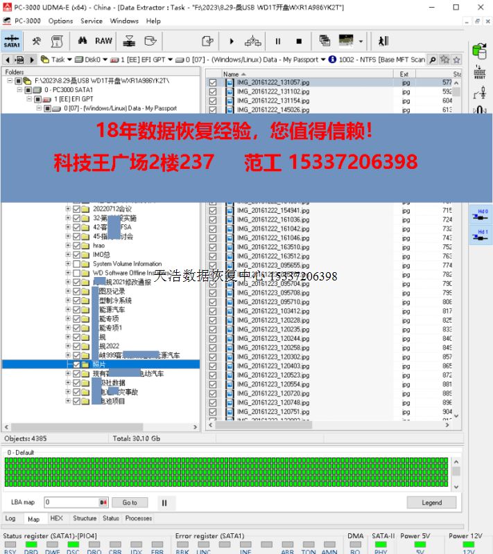 解决方案:收到硬盘后,在无尘环境更换兼容的磁头,更换兼容的SATA电路板,接到专业数据恢复工具PC3000 UDMA EXPRESS上,通电硬盘认盘,备份好关键固件,做好前期处理工作后,DE分头镜像,最后客户硬盘内重要数据大部分成功恢复!