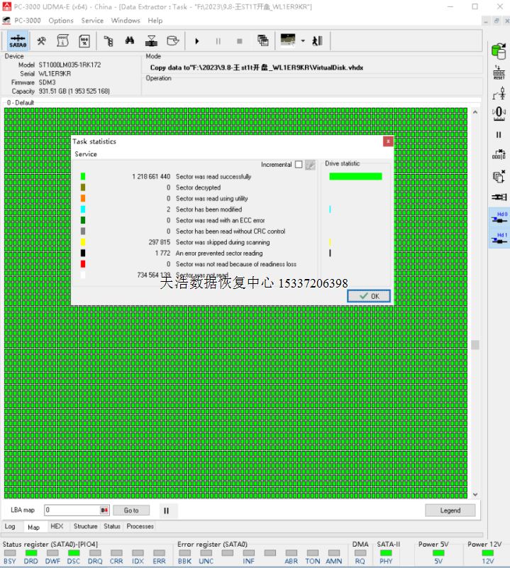 解决方案:收到硬盘后,在无尘环境打开盘体,更换兼容的磁头,再接到数据恢复工具PC-3000 UDMA Express上,通电,硬盘正常认盘,备份关键固件后,DE分头镜像,最后客户硬盘内重要数据大部分成功恢复!