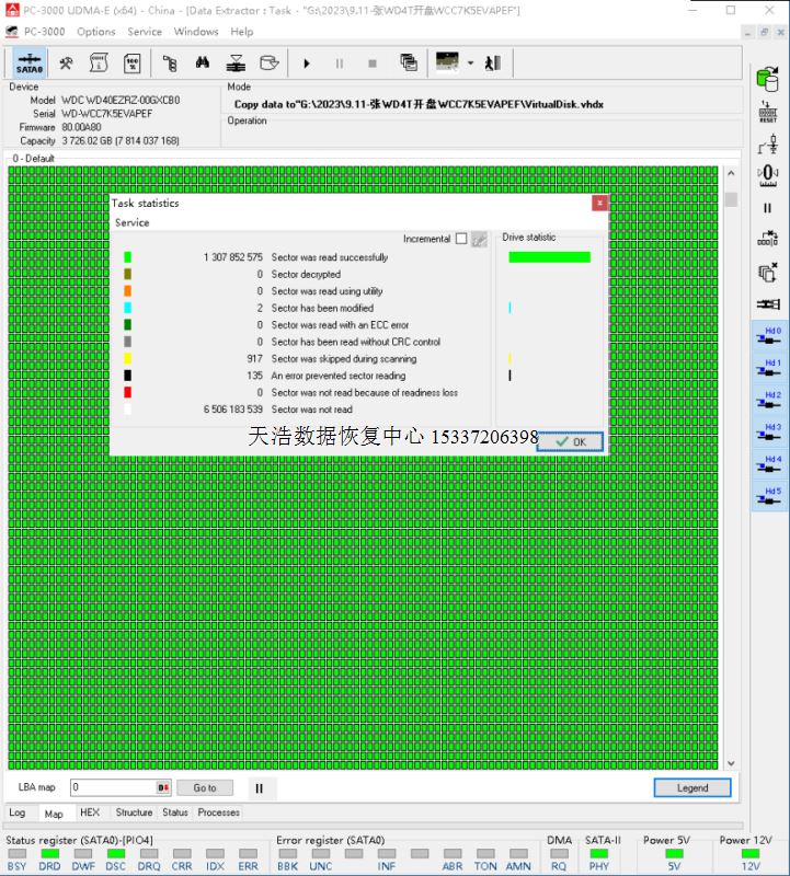 解决方案:收到硬盘后,接到专业数据恢复工具PC3000 UDMA Express上,通电硬盘正常认盘,备份好固件,分头测试,发现2头不良,在无尘环境更换兼容的磁头,再接到专业数据恢复工具PC3000 UDMA Express上,通电硬盘正常认盘,DE分头镜像,成功恢复硬盘内客户公司几乎全部数据!