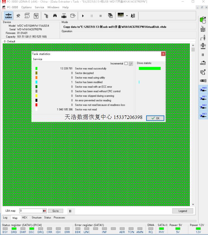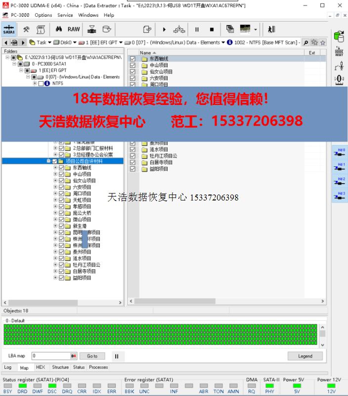 解决方案:收到硬盘后,在无尘环境更换兼容的磁头,更换兼容的SATA电路板,接到专业数据恢复工具PC3000 UDMA EXPRESS上,通电硬盘认盘,备份好关键固件,做好前期处理工作后,DE分头镜像,最后客户硬盘内重要数据基本完美恢复!