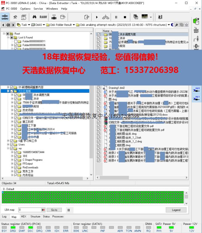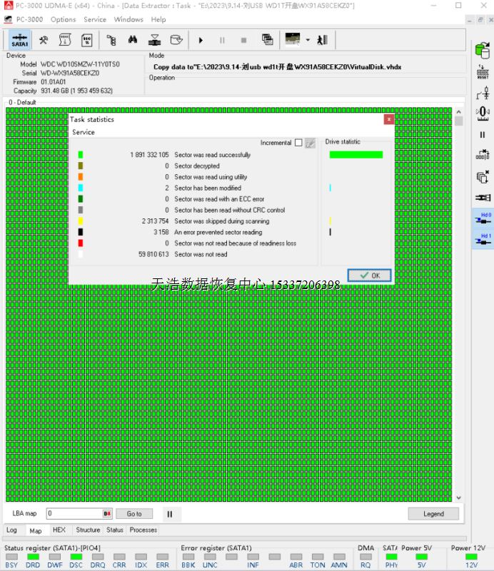 解决方案:收到硬盘后,在无尘环境更换兼容的磁头,更换兼容的SATA电路板,接到专业数据恢复工具PC3000 UDMA EXPRESS上,通电硬盘认盘,备份好关键固件,做好前期处理工作后,DE分头镜像,最后客户硬盘内重要数据绝大部分成功恢复!