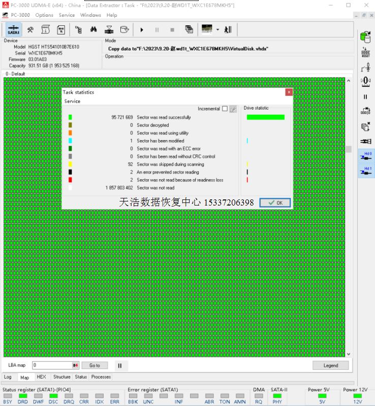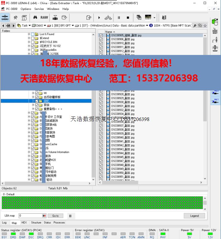 解决方案:收到硬盘后,我们在无尘环境更换兼容的磁头,再接到专业数据恢复工具PC3000 UDMA-E上,通电硬盘正常认盘,DE镜像,成功恢复客户硬盘内几乎全部数据!
