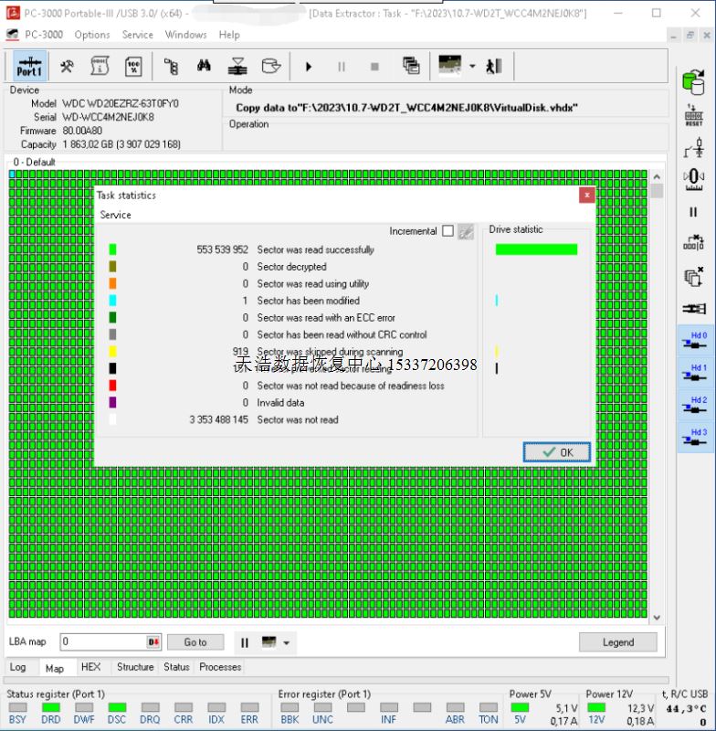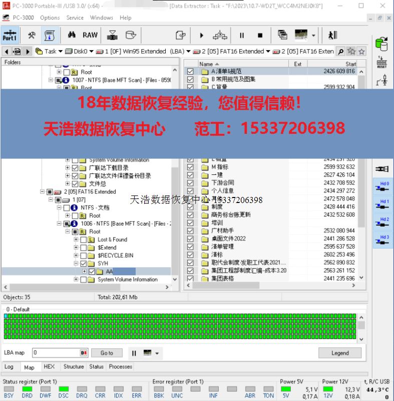解决方案:收到硬盘后,在无尘环境更换兼容的磁头,再接到专业数据恢复工具ACE PC-3000 Portable-III上,通电硬盘正常认盘,做好固件备份和数据恢复前的准备工作,DE分头镜像,成功恢复硬盘内客户单位的几乎全部重要数据!