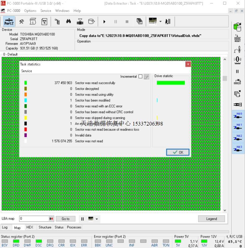 解决方案:收到硬盘后,我们在无尘环境更换兼容的磁头,再接到数据恢复工具PC-3000 Portable-III上,通电认盘,DE分头镜像,客户硬盘内数据基本完美恢复。