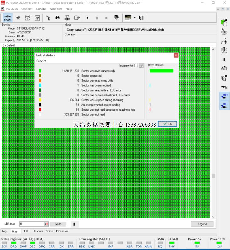 解决方案:收到硬盘后,在无尘环境打开盘体,更换兼容的磁头,再接到数据恢复工具PC3000 UDMA EXPRESS上,通电,硬盘正常认盘,备份关键固件后,做好恢复前期的处理工作后,DE分头镜像,最后客户硬盘内重要数据大部分成功恢复!