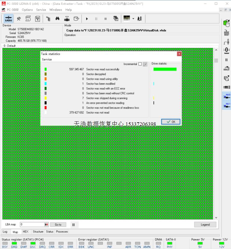 解决方案:收到硬盘后,接到数据恢复工具PC-3000 UDMA Express上,通电硬盘就绪忙,通过终端备份固件,再处理固件后,再断电通电,硬盘正常认盘,DE分头镜像,发现1头不良,在无尘环境更换兼容的磁头,通电认盘,继续镜像,最后硬盘内的数据基本完美恢复!