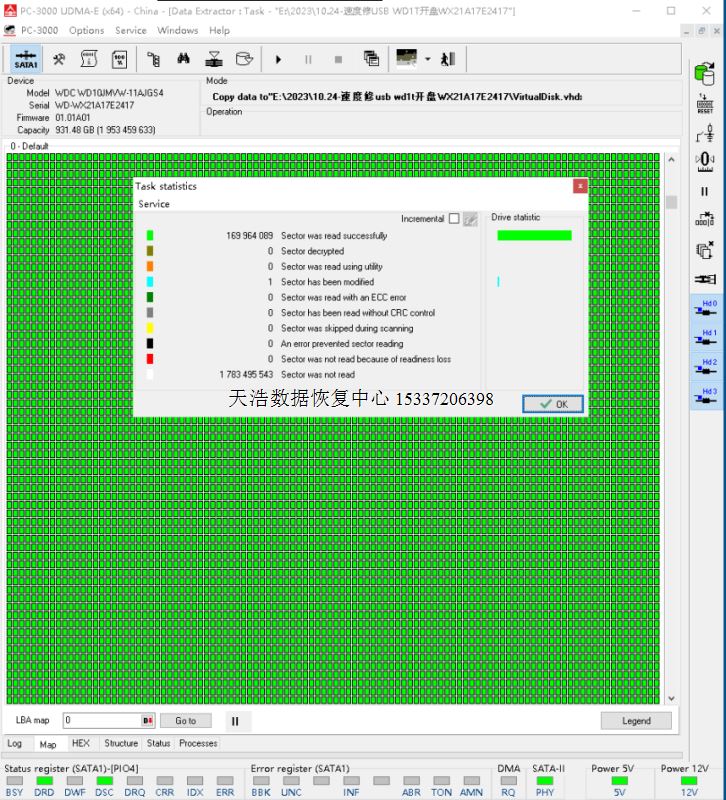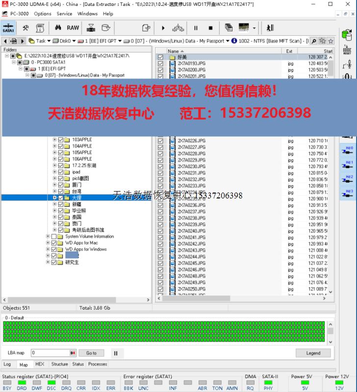解决方案:收到硬盘后,在无尘环境更换兼容的磁头,更换兼容的SATA电路板,接到专业数据恢复工具PC3000 UDMA EXPRESS上,通电硬盘认盘,备份好关键固件,做好前期处理工作后,DE分头镜像,最后客户硬盘内的照片基本完整恢复!