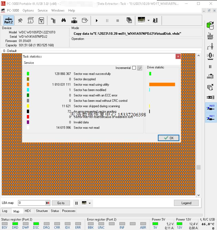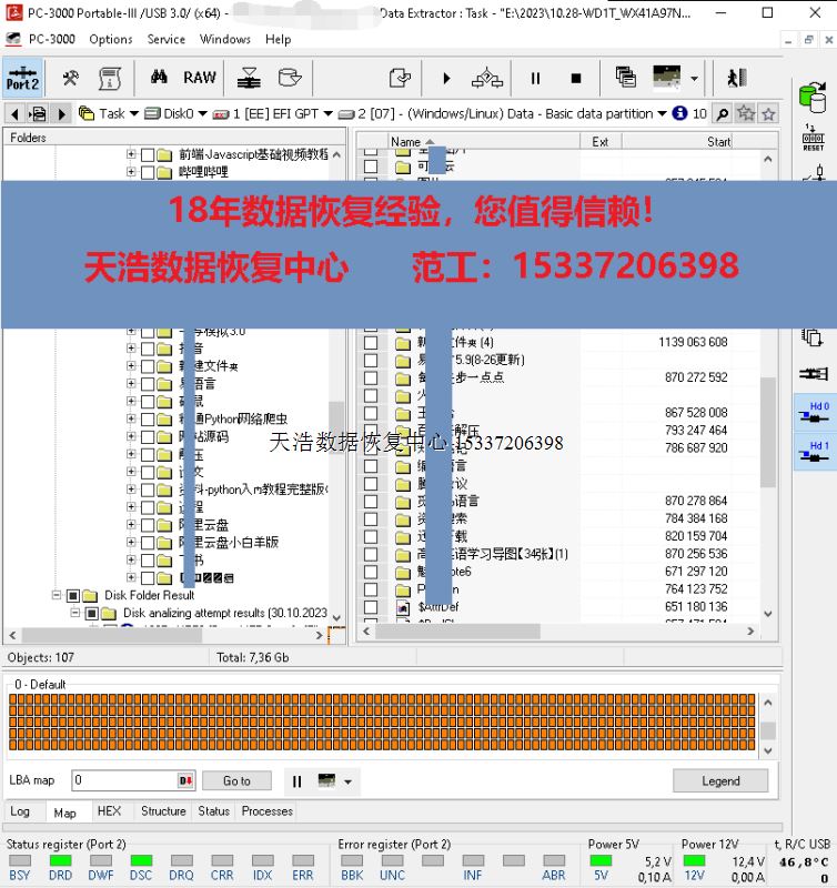 解决方案:收到硬盘后,在无尘环境更换兼容的磁头,接到专业数据恢复工具ACE PC-3000 Portable III上,通电硬盘认盘,备份好关键固件,DE分头镜像,最后客户硬盘内重要数据基本完美恢复!
