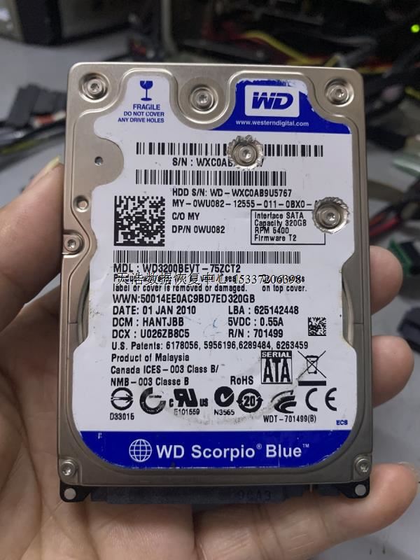 硬盘型号:WD3200BEVT-75ZCT2 SN:WXC0AB9U5767 FW:800FP 电路板号:701499-000