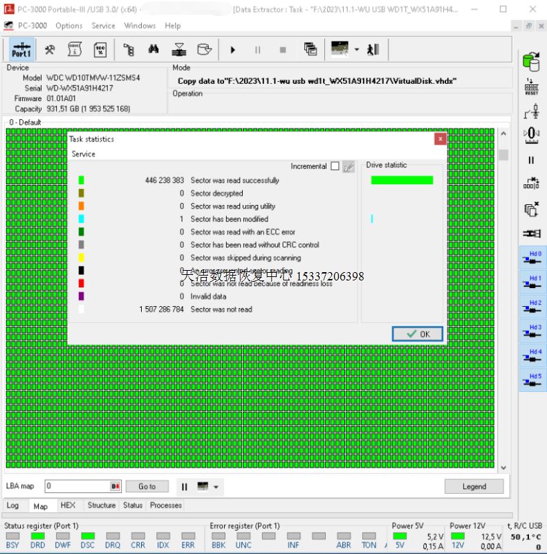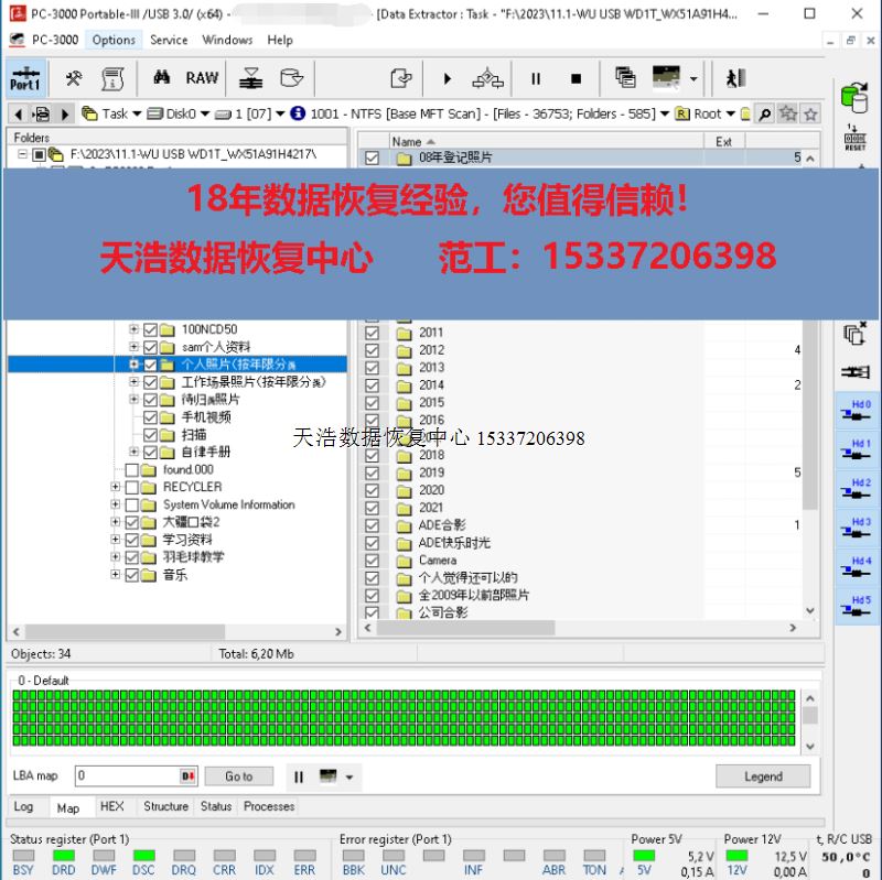 解决方案:收到硬盘后,在无尘环境更换兼容的磁头,更换兼容的SATA电路板,接到专业数据恢复工具ACE PC-3000 Portable III上,通电硬盘认盘,备份好关键固件,做好前期处理工作后,DE分头镜像,最后客户硬盘内十几年的备份数据完美恢复!