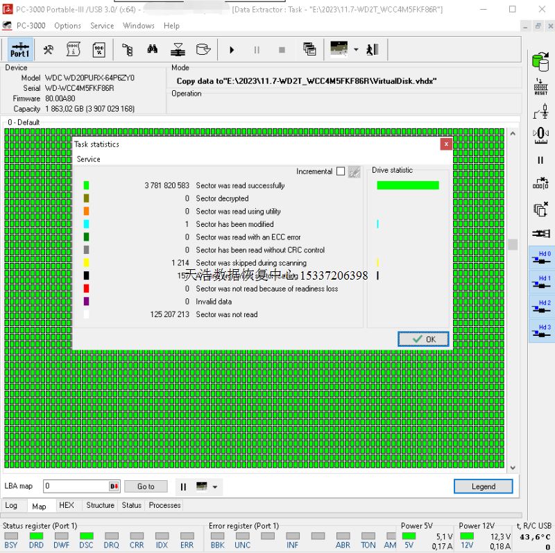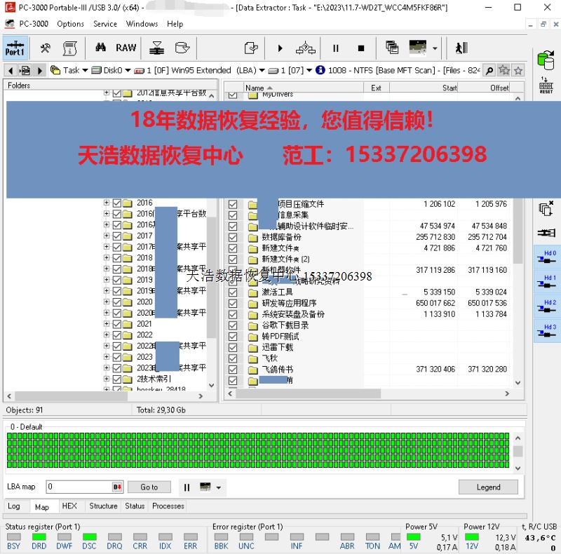 解决方案:收到硬盘后,在无尘环境更换兼容的磁头,再接到专业数据恢复工具ACE PC-3000 Portable-III上,通电硬盘正常认盘,做好固件备份和数据恢复前的准备工作,DE分头镜像,成功恢复硬盘内客户单位的几乎全部重要数据!