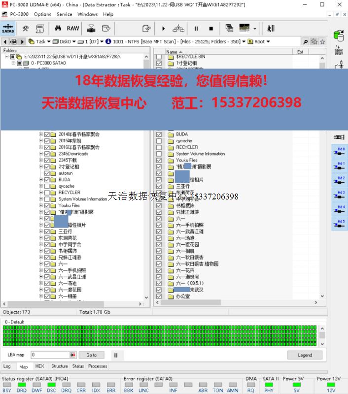 解决方案:收到硬盘后,在无尘环境更换兼容的磁头,更换兼容的SATA电路板,接到专业数据恢复工具ACE PC3000 UDMA EXPRESS上,通电硬盘认盘,备份好关键固件,做好前期处理工作后,DE分头镜像,最后客户硬盘内数据完美恢复!