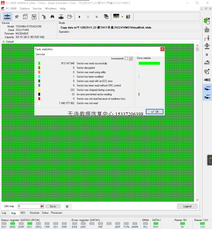 故障现象:东芝1T台式机硬盘,通电认盘,分区打不开,提示I/O错误。
