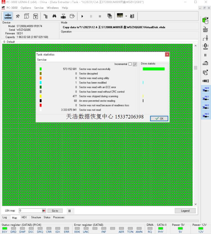 解决方案:收到硬盘后,在无尘环境开盘,发现盘片有轻微损伤,清洗盘片后,更换兼容的磁头,接到数据恢复工具PC-3000 UDMA Express上,通电硬盘不认盘,检测备份修复固件后,再断电通电,硬盘正常认盘,DE分头镜像,最后客户硬盘内大部分重要数据成功恢复!