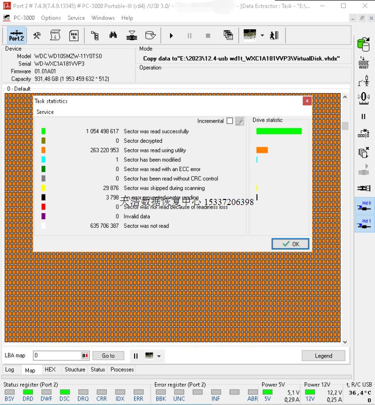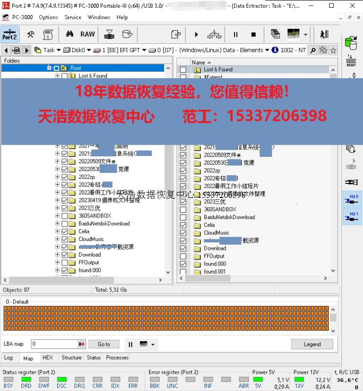解决方案:收到硬盘后,在无尘环境更换兼容的磁头,更换兼容的SATA电路板,接到专业数据恢复工具ACE PC-3000 Portable-III上,通电硬盘认盘,备份好关键固件,做好前期处理工作后,DE分头镜像,最后客户硬盘内大部分数据成功恢复!