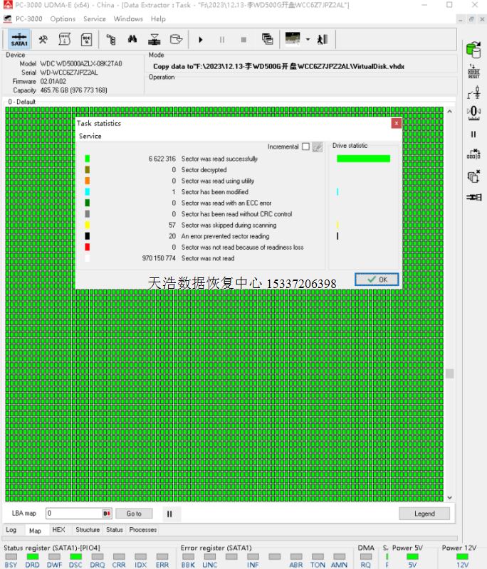 解决方案:收到硬盘后,我们在无尘环境拆开硬盘,更换兼容的磁头,再接到专业数据恢复工具PC3000 UDMA EXPRESS上,通电硬盘正常认盘,做好固件备份及常规固件处理工作后,DE分头镜像,成功恢复硬盘内客户公司的几乎全部重要数据!