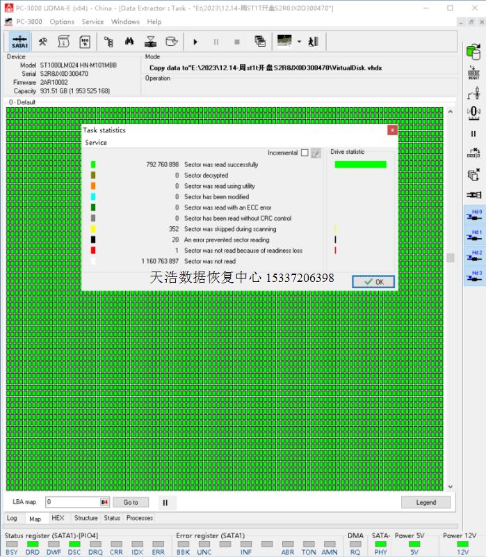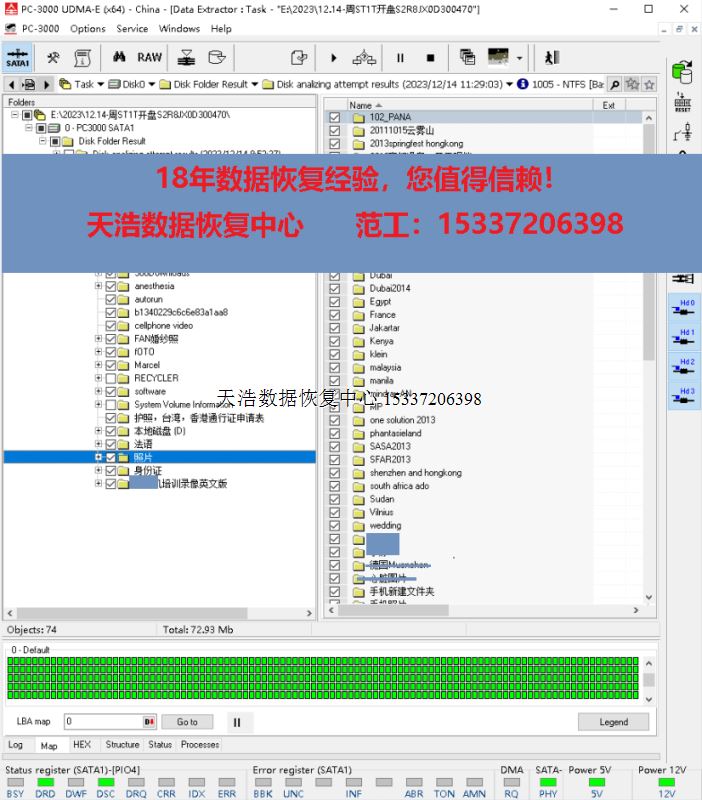解决方案:收到硬盘后,接到专业数据恢复工具PC-3000 UDMA Express上,通电检测,发现是有一个磁头不良,我们在无尘环境更换兼容的磁头,再通电硬盘正常认盘,DE分头镜像,成功恢复硬盘内几乎全部数据!