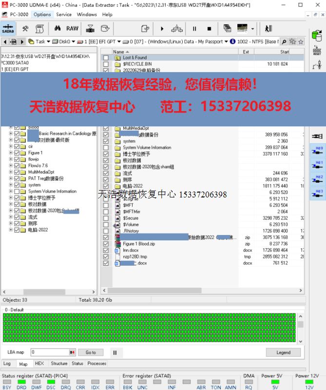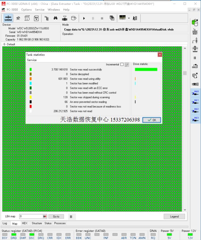 解决方案:收到硬盘后,我们在无尘环境更换兼容的磁头,更换兼容的SATA电路板,接到专业数据恢复工具ACE PC3000 UDMA EXPRESS上,通电硬盘正常认盘,备份好关键固件后,做好镜像前的处理工作后,DE分头镜像,最后客户硬盘内重要数据基本完整恢复!