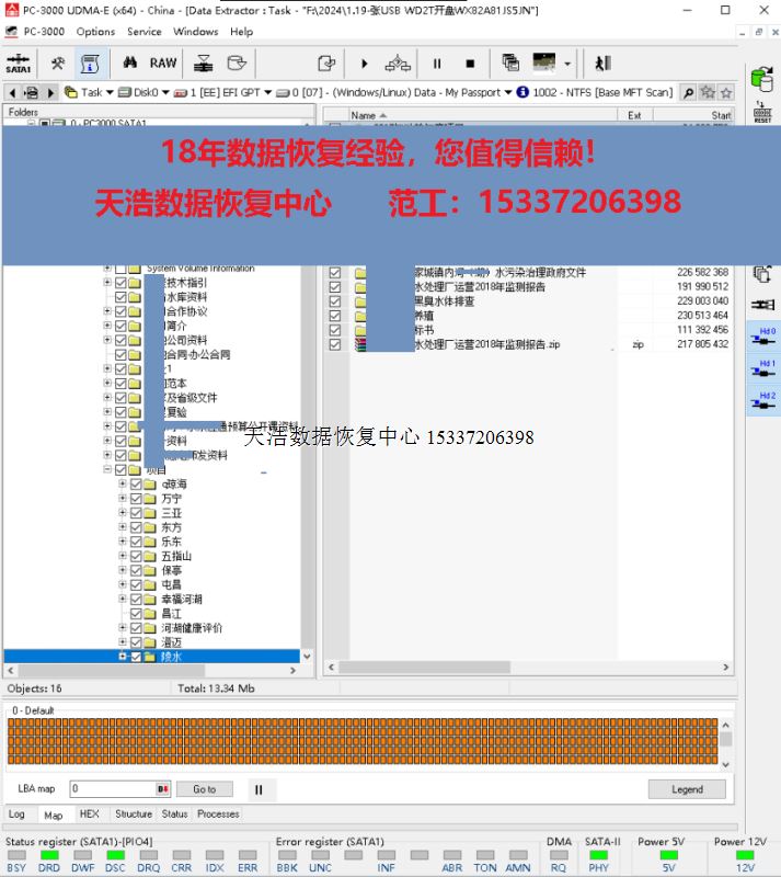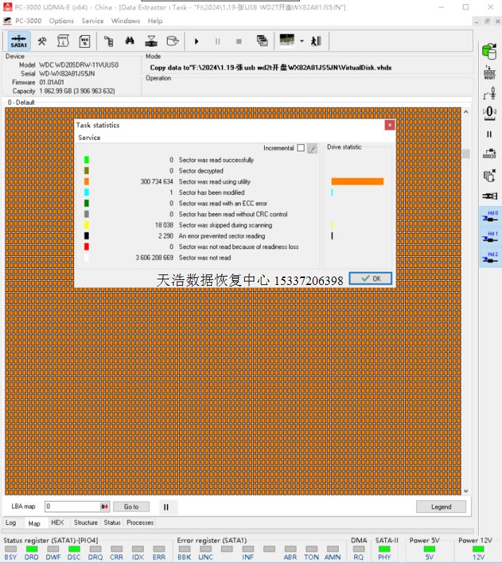 解决方案:收到硬盘后,我们对原usb板解锁,飞线改SATA,再接到专业数据恢复工具ACE PC3000 UDMA EXPRESS上,备份、处理好固件问题后,再通电硬盘正常认盘,做好固件常规处理操作后,DE分头,镜像,最后客户硬盘内重要数据大部分成功恢复!