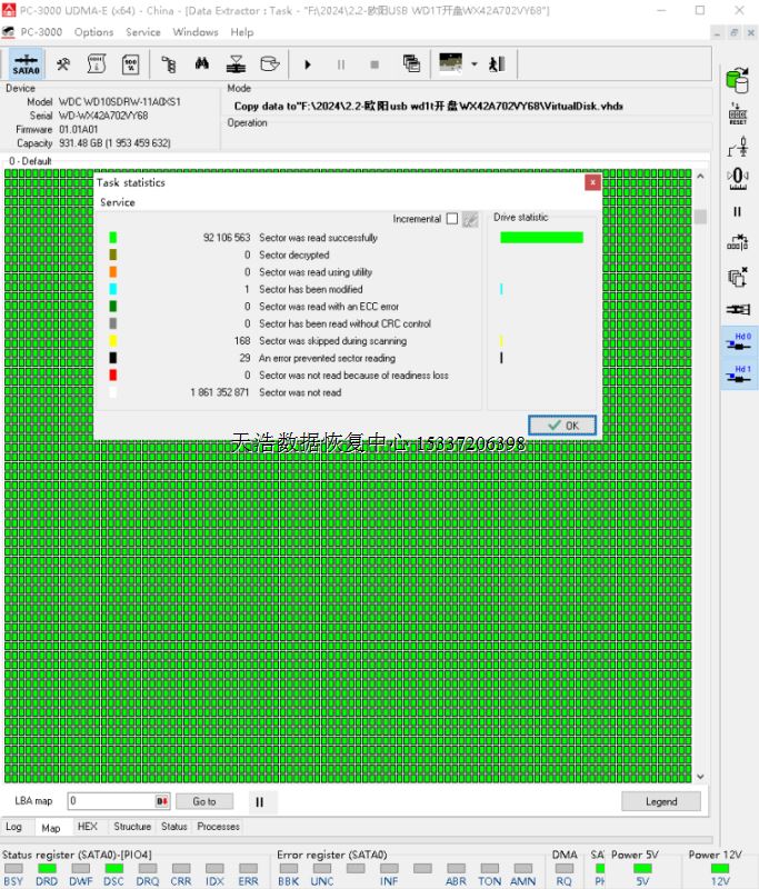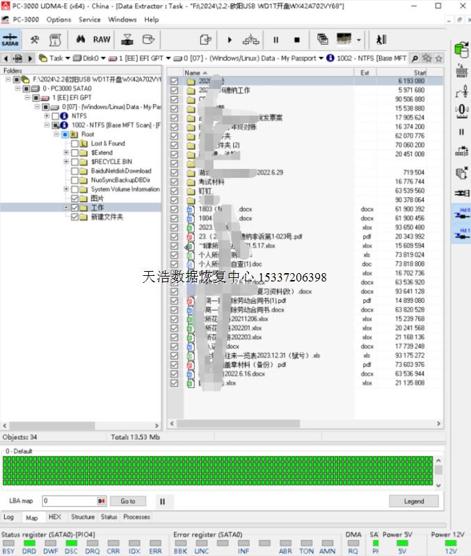 解决方案:收到硬盘后,在无尘环境更换兼容的磁头,原始usb板解锁再飞线改SATA,接到专业数据恢复工具PC3000 UDMA EXPRESS上,通电硬盘认盘,备份好关键固件,做好前期处理工作后,DE分头镜像,最后客户硬盘内的重要数据基本完美恢复!