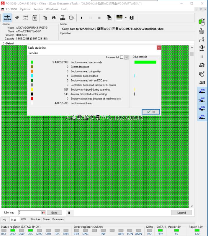 解决方案:收到硬盘后,在无尘环境更换兼容的磁头,再接到专业数据恢复工具ACE PC3000 UDMA EXPRESS上,通电硬盘就绪忙,处理固件问题后,再通电硬盘正常认盘,DE分头镜像,成功恢复硬盘内客户单位的几乎全部重要数据!