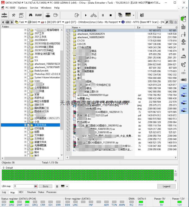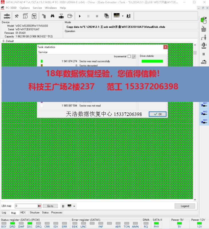 解决方案:收到硬盘后,我们在无尘环境更换兼容的磁头,原板解锁飞线,接到专业数据恢复工具ACE PC3000 UDMA EXPRESS上,通电硬盘正常认盘,备份好关键固件后,做好镜像前的处理工作后,DE分头镜像,最后客户硬盘内重要数据基本完整恢复!