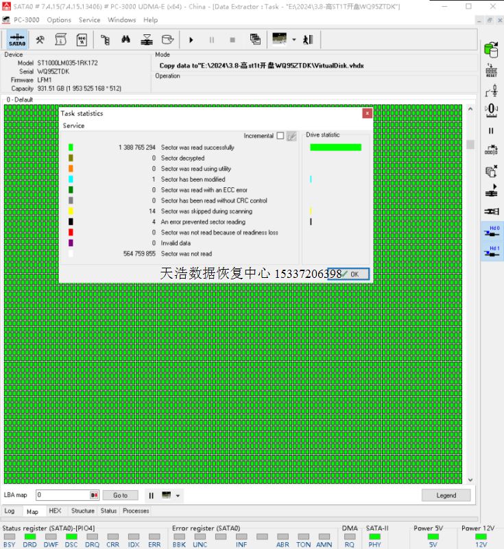 解决方案:收到硬盘后,在无尘环境更换兼容的磁头,再接到数据恢复工具ACE PC3000 UDMA EXPRESS上,通电硬盘正常认盘,做好重要固件备份和数据恢复前的关键操作后,DE分头镜像,最后客户硬盘内重要数据完美恢复!