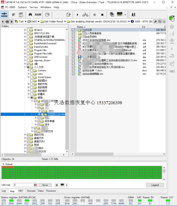 解决方案:收到硬盘后,检测硬盘正常认盘,但型号变成SATAFIRMS11,容量显示正常,但用工具检测发现全盘底层都是00。这是PS3111这种主控的通病!我们使用专业的SSD恢复工具ACE PC3000 SSD,虚拟重建编译器,用PC3000 DE虚拟镜像,成功恢复客户硬盘内桌面的大部分重要数据。