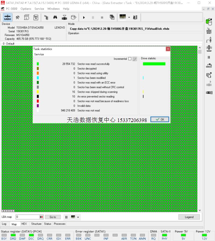 解决方案:收到硬盘后,在无尘环境更换兼容的磁头,再接到专业数据恢复工具ACE PC3000 UDMA EXPRESS上,通电硬盘正常认盘,备份好固件,DE镜像,成功恢复客户硬盘内几乎全部重要数据!