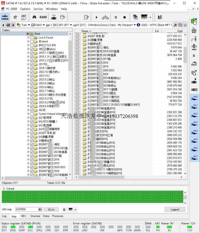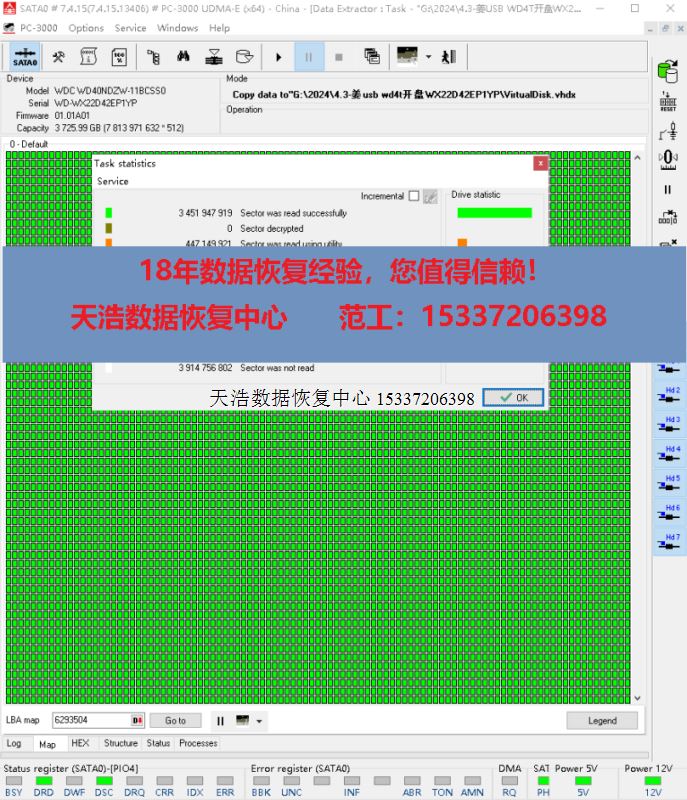 解决方案:收到硬盘后,我们在无尘环境更换兼容的磁头,原始usb板解锁后飞线改SATA,接到专业数据恢复工具ACE PC3000 UDMA EXPRESS上,通电硬盘正常认盘,备份好关键固件,做好镜像前的处理工作后,DE分头镜像,最后客户硬盘内重要数据大部分成功恢复!全都是客户多年来各地旅游的照片和视频数据。