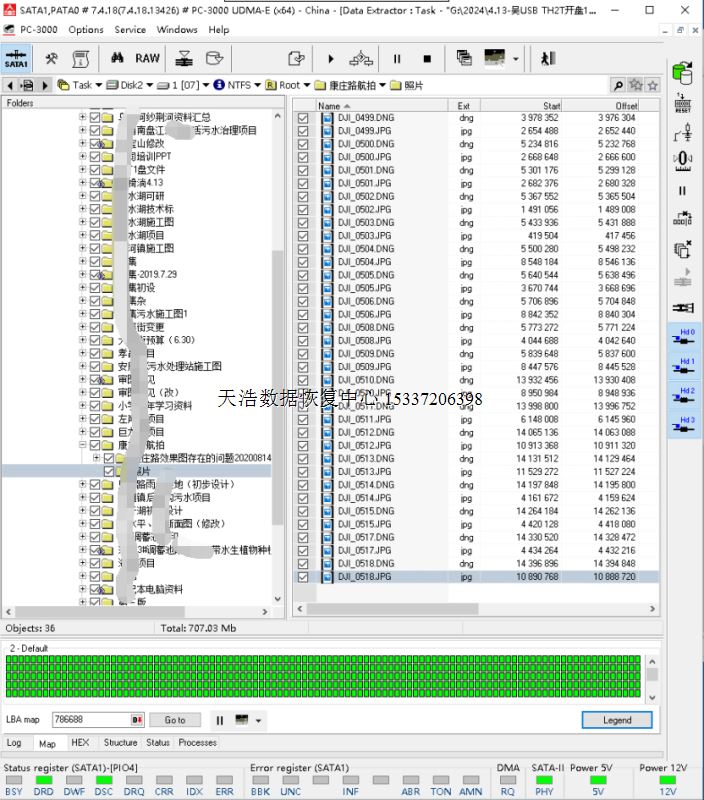 解决方案:收到硬盘后,我们更换兼容的SATA电路板,接到数据恢复工具PC3000 UDMA EXPRESS上,处理固件问题,DE分头检测,发现2头不良。在无尘环境更换兼容的磁头,再通电声音正常认盘正常,DE镜像,成功恢复客户硬盘内几乎全部重要数据。