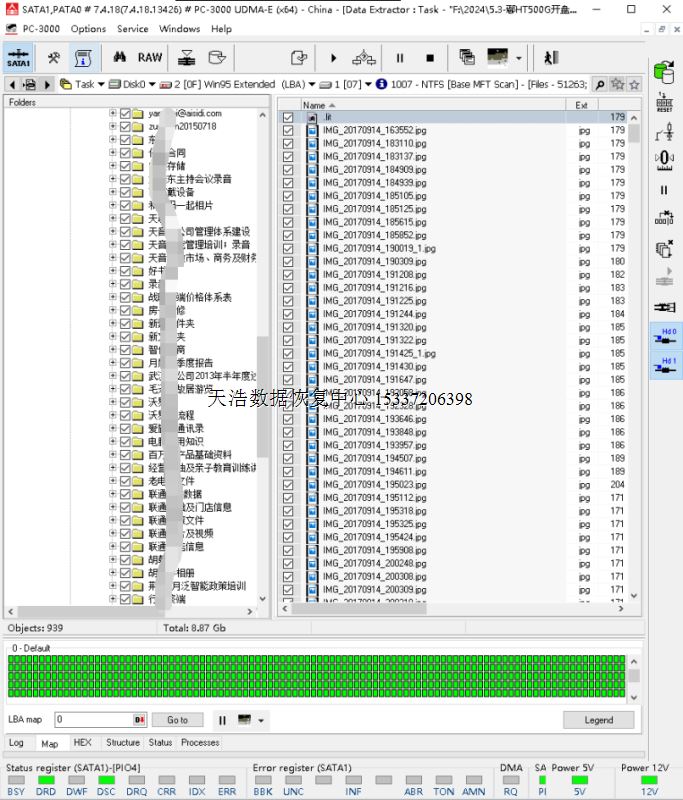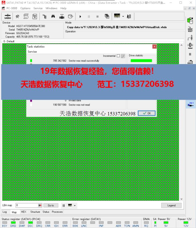 解决方案:收到硬盘后,接到数据恢复工具PC-3000 UDMA Express上,检测发现1头损坏,从备件库找到匹配的备件,在无尘环境更换磁头,再通电硬盘正常认盘,虚拟处理后,数据区前后都能正常访问,DE分头镜像,成功恢复客户硬盘内几乎全部重要数据!