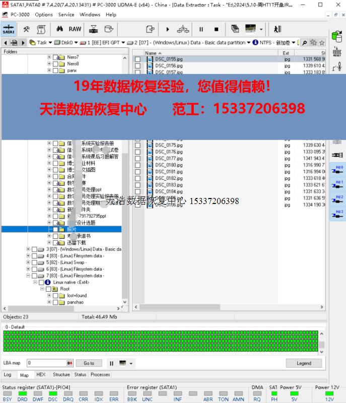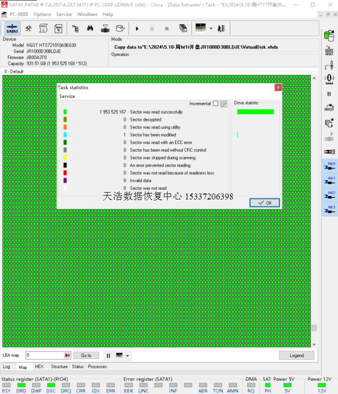 解决方案:收到硬盘后,从备件库找到匹配的备件,在无尘柜环境更换磁头,接到数据恢复工具PC-3000 UDMA Express上,通电硬盘正常认盘,虚拟处理后,数据区前后都能正常访问,DE分头镜像,客户硬盘内重要数据完美恢复!