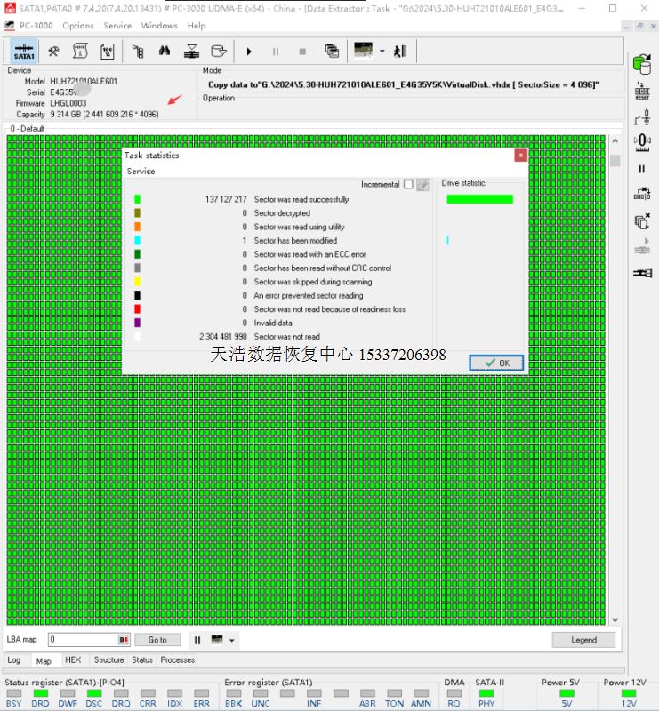 解决方案:收到硬盘后,通过特殊方法处理好固件问题后,硬盘前后扇区都能正常访问,PC3000全盘镜像,成功恢复硬盘内几乎全部数据!