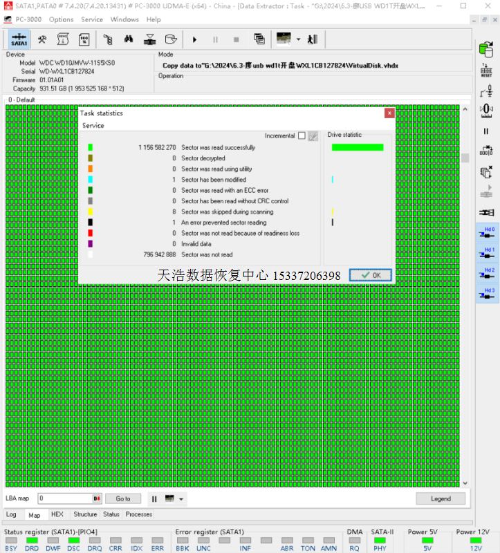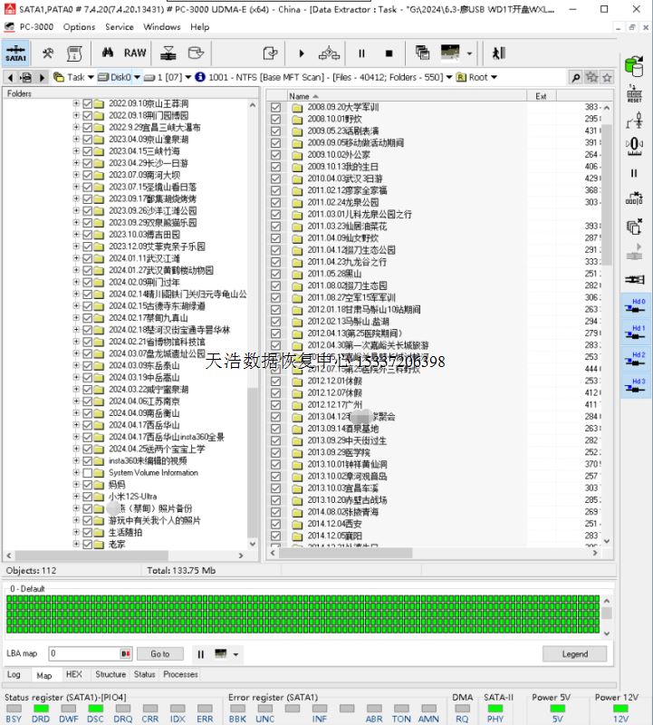 解决方案:收到硬盘后,在无尘环境更换兼容的磁头,更换兼容的SATA电路板,接到专业数据恢复工具ACE PC-3000 UDMA Express上,通电硬盘认盘,备份好关键固件,做好前期处理工作后,DE分头镜像,最后客户硬盘内重要数据基本完美恢复!