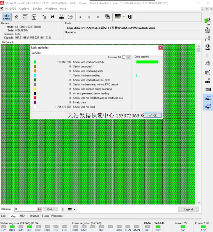 解决方案:收到硬盘后,在无尘环境打开盘体,更换兼容的磁头,再接到数据恢复工具PC-3000 UDMA Express上,通电,硬盘正常认盘,备份关键固件后,DE分头镜像,最后客户硬盘内重要数据完美恢复!