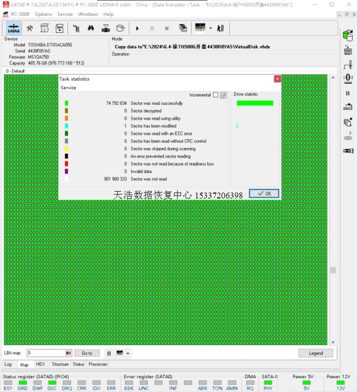 解决方案:收到硬盘后,在无尘环境更换兼容的磁头,接到专业数据恢复工具ACE PC3000 UDMA EXPRESS上,通电硬盘正常认盘,备份好固件,成功恢复客户硬盘内全部重要数据!包括客户公司软件的数据备份,经验证也ok!